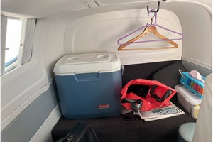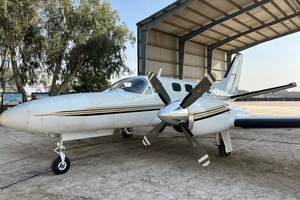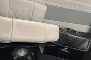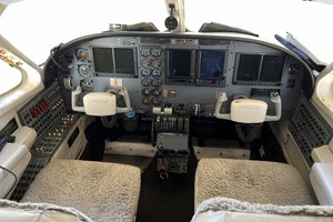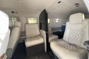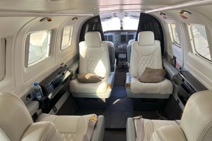 Six passenger configuration. Forward – 4-place club. Aft – side-facing seat opposite the door with aft, forward-facing seat. Toilet in aft section. Light Beige over light Grey leather seats with Gold plate accessories. Dark wood veneer cabinetry. Charcoal carpet.