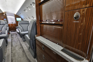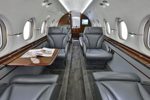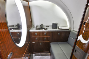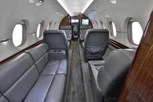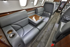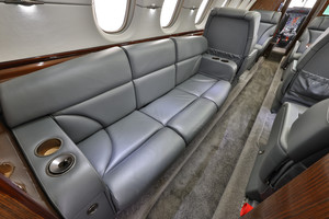 | New Interior 2018. Nine (9) passenger interior with Dark Grey leather seats and carpet, headliner and window panels are satin White ultra-leather material, woodwork is high gloss Dark Walnut with Black pearl hardware, forward club arrangement with single forward facing seat on RH side in aft cabin and 3 place divan on LH side. Forward LH galley w/microwave oven, RH forward baggage/storage. One Cockpit, two Cabin, and one Lav 110 VAC Outlets. Aft belted flushing Lavatory with sink. |