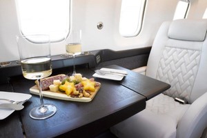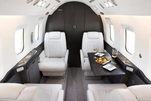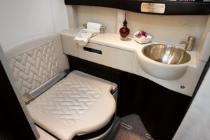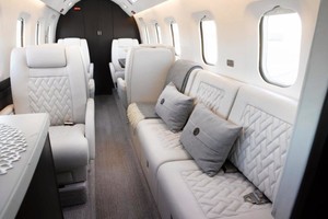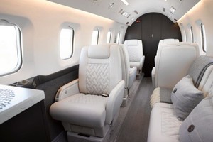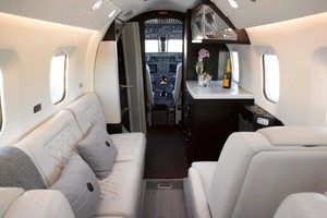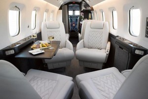| Eight (8) Place Executive Interior w/Belted Lavatory for a 9th Passenger.  The newly refurbished interior offers a large forward galley with a new countertop and an acoustical main door curtain for additional privacy. The forward cabin features a three (3) place divan opposite a single (1) forward facing chair. In the aft cabin there is a four (4) place club arrangement followed by a belted lavatory.  |