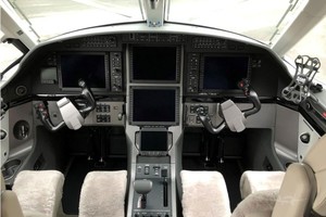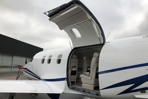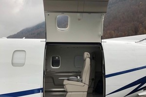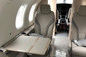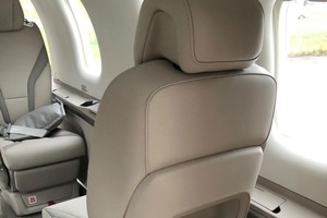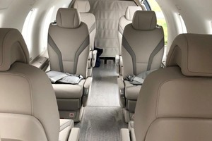 This aircraft features an Executive Six-Seat Two-Standard Tundra interior configuration. The cabin offers fully reclining and swiveling seats with adjustable headrests, lumbar support and leg rests, ensuring exceptional passenger comfort. The interior is finished in light-beige leather with subtle contrasting inserts, complemented by refined light wood cabinetry, neutral carpeting and executive folding tables, creating a bright and modern cabin environment.
