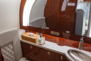 Features a belted lavatory seat that can be used as an additional passenger seat.