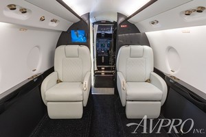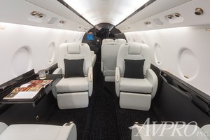 Elegant ten (10) passenger interior featuring a fully equipped forward galley followed by a forward four (4) place club arrangement and an aft four (4) place conference group opposite a (2) place berthable