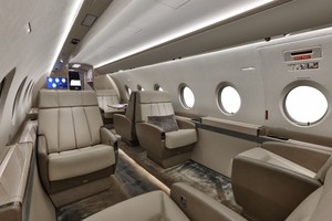 An executive 8 passenger configuration featuring a forward four-place club and an aft four-place club