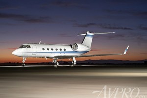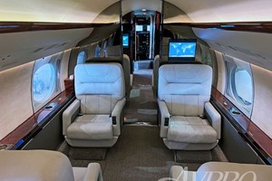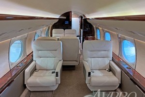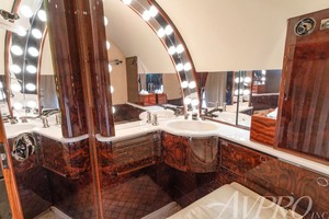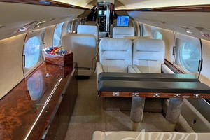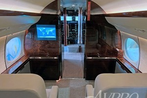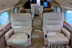 The forward cabin offers a crew Refreshment Center and crew lavatory followed by two (2) forward facing chairs convenient for conducting business. The mid cabin offers a four (4) place club arrangement followed by an aft four (4) place conference table opposite a credenza with pop up monitor.