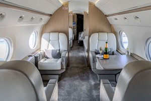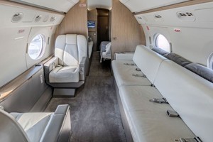 Eighteen (18) passenger forward full service galley configuration offering three spacious separate cabins (separated by pneumatic sliding pocket doors). Interior color scheme offers neutral gray leather seating and sculptured carpeting.