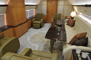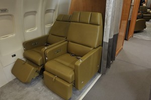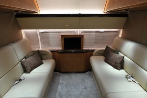 • The forward cabin houses the lounge area, which is laid out with a right-side conference/meeting group with a four-place divan with two executive chairs and two Hi Lo tables. On the left side of the lounge area is a two-place club style seating arrangement with entertainment cabinet