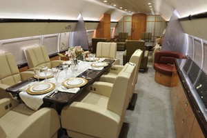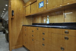 • The mid cabin area houses a dining group made up of six individual executive style seats with a hi lo meeting/dining table. There is a full-length credenza on the right side along with a corner observation/secretary chair.