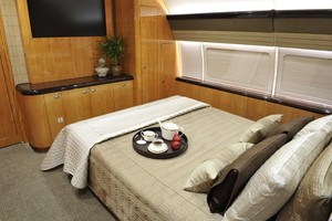 • The hallway leads further into the master bedroom area. The master bedroom a full-size bed and night tables with reading lights, wardrobe and a 42h flat screen TV/monitor on the aft bulkhead.