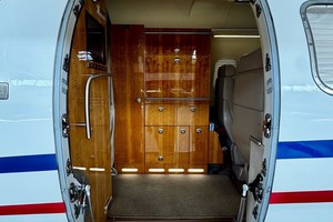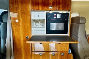Cabin amenities include Wi-Fi, Airshow 4000 with 12.1” front and rear screens, single DVD, CD changer, 2 A/V inputs, Microwave Oven, heated liquid dispenser, four folding tables, 110 AC outlets at six locations, forward magazine rack and additional storage drawers in the seat bases.
