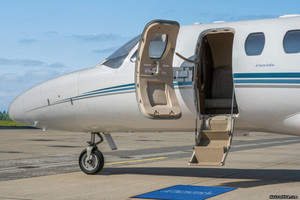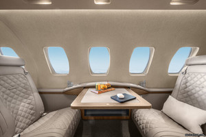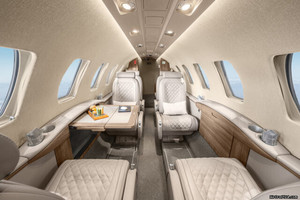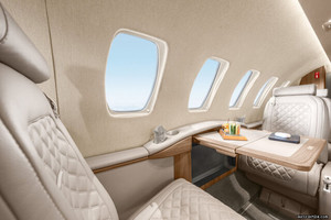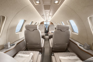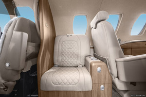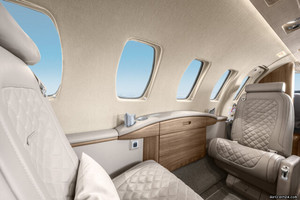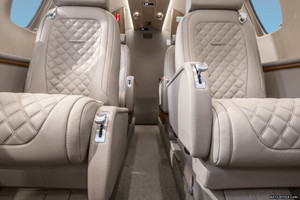 Cabin renewed / refurbished 2022, Six (6) passenger executive seating in beige leather (four club seating, two single fwd facing seats), one side facing seat (7) plus belted lav seat (8), brown carpet, brown wood veneer, lavatory separated by a sliding door for privacy, small refreshment center (hot Cup), brushed aluminium hardware, 115 V AC Cabin and Cockpit power outlets