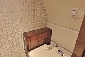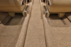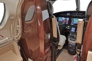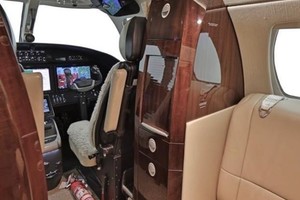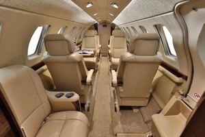 Executive eight (8) passenger interior includes a forward side-facing seat (option, interchangeable with galley), followed by four place club setting, two (2) aft forward facing seats and aft belted lavatory. All seating is completed in natural tan leather, and finished with Honduran Mahogany wood veneer, hardware in brushed metal, tweed headliner, and rich sandstone woold carpet.