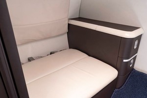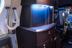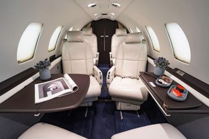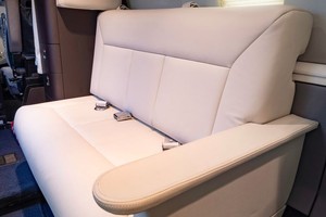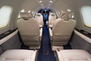 • Nine (9) Passenger Seating in Beige Leather including Four Club Seats, Two Single Forward Facing Seats, Two (2) Place Forward Divan, and Belted Lavatory Accented with Navy Carpet.