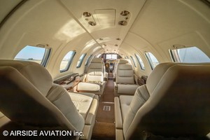 7-passenger executive configuration Mid-cabin 6-place club seating, 1-single, forward left-side storage cabinet, aft avionics storage, belted flushing aft lav.