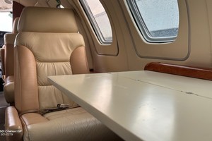 Interior features comfortable leather seating for up to 7 passengers in a beige, tan and brown color scheme. Club seating with dual folding tables and bench in aft cabin; rear facing seat and belted emergency toilet in fwd cabin.