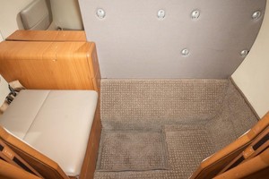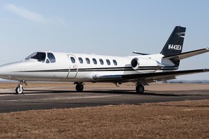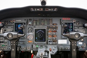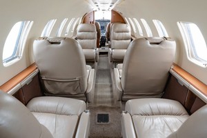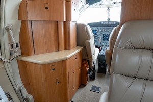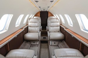 Seven passenger executive interior is a center club configuration with two forward aft-facing seats and aft belted lavatory seat. Additional cabin amenities include forward left deluxe refreshment center, dual executive writing tables in center club setting.