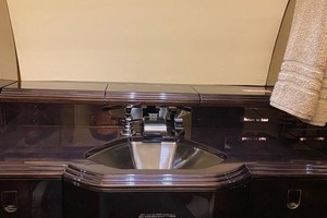 • Galley: Forward galley finished in high-gloss wood veneer, equipped with multiple storage drawers, glassware compartments, and service space