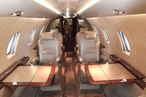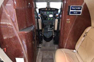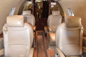 The nine-passenger interior is arranged in a center club, two single forward facing seats aft, a right hand forward two place divan and an additional 9th belted lavatory seat. Amenities include a forward left hand galley with, heated coffee dispenser, ice drawer with overboard drain and ample dry gods storage. There is a private aft flushing, exteriorly serviced, lavatory with hard partitions and additional baggage/coat storage.