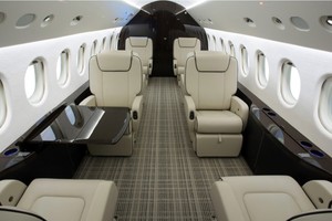 High-density, 16-passenger occupancy, including eight single seats and two 4-place divans. The seat leather is a light creamy color with black welt cord accents. The lower sidewall is black leather with an embossed pattern and contrasting stitching. The galley counter is a light solid surface with a subtle grain. The dark, straight grain veneer was applied vertically for a classic finish. The carpet is a simple