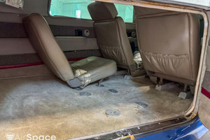 The interior of the aircraft has gray vinyl and fabric panels with maroon details and tan vinyl seats and carpet.