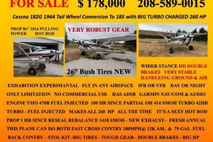 This plane can do both fast cross country 180MPH and rough back country flying ( DO IT ALL WITH ONE PLANE ) . 2015 after nose wheel damage plane was moved to EXPERIMENTAL and converted to tail wheel using a Murphy moose landing gear assemble work completed by certified AMP gate 9 aircraft Idaho falls and myself the owner . 2019 engine upgrade from 230 HP carb to 260HP TSIO 470 fuel injected and turbo charged NOW ITS A HOT ROD . 400 hour engine and prop was just rebuilt . Stable easy 182 flying and the most stable tail wheel around with the big wide stance heavy duty gear .