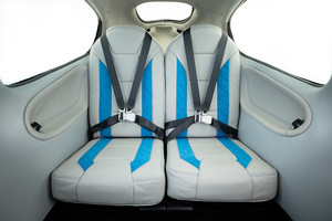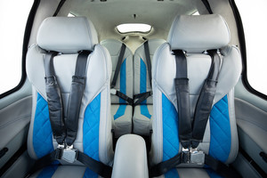 | Ivory leather interior with Blue Suede Accents, Blue accent stitching and Black seatbelts. Ivory suede upper headliner and Black carpet. Custom Black and Ivory dash with Carbon fiber instrument panel. |