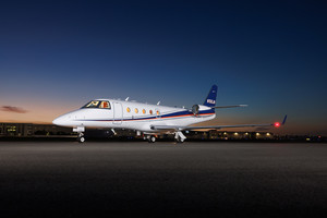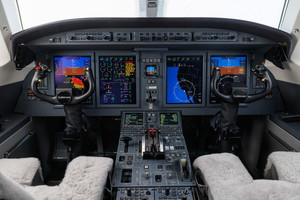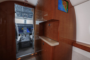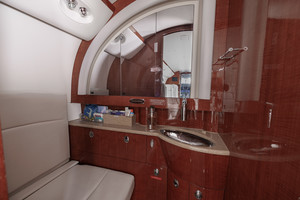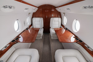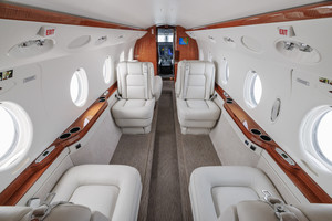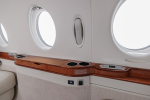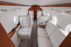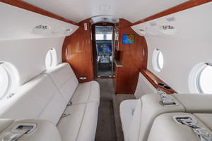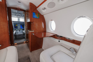 | Seven (7) place universal cabin configuration in Avion Contrail Grey Leather that includes a four-place (4) aft club, two (2) place forward left bench seat with one (1) forward right single seat. Foliage Grey Carpet. Belted, flushing aft lavatory seat. Cabin furnishings include a forward right-hand refreshment center with microwave oven, medium wood executive tables and forward cabin 15" LCD swing out monitor. |