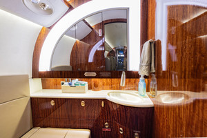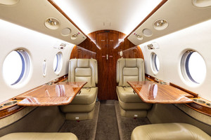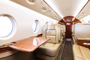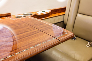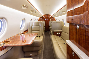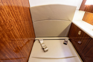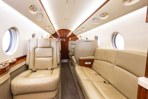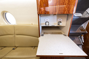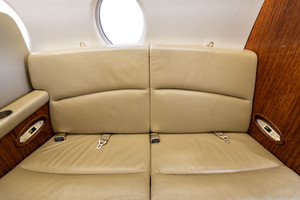 Passenger Seating: Nine (9) Approved for Taxi, Takeoff & Landing, Including Belted Lavatory (Note: Maximum Eight (8) Passengers with Life Rafts installed for over water operations) Configuration & Miscellaneous: This Gulfstream G150âs cabin configuration consists of a forward righthand 2-place club opposite a 2-place divan and an aft 4-place club. There is a forward left-hand galley opposite a storage closet, and the tailcone features a heated baggage compartment. The entryway has an acoustic drape, the lavatory features bulkhead pocket doors, and 115 VAC outlets are installed throughout the interior. Cabin Management: The cabin management system features a VIP Seat controller with cabin temperature control. Interior Finishes: The interior features Reddish-Brown Gloss Veneer, Nickel-colored decorative hardware plating, and Cream countertops. Brown carpet is installed throughout the entryway and main cabin. The cabin headliner, PSU, and window panels are covered in âMilkweedâ Ultraleather, and the lower sidewall is finished in Brown leather. The cabin seats are covered in Tan leather. The cabin upper sidewalls were recovered in 2015. Galley: Forward Galley equipment includes dual hot liquid containers with drip tray, gasper-cooled can and bottled water storage, and a divided ice drawer. Lavatory: Aft The aft lavatory is equipped with an externally serviced toilet and a vanity with sink and faucet. Baggage Compartment: A heated baggage compartment is located in the aircraftâs tailcone, and the lavatory features a closet with coat rod. |