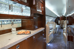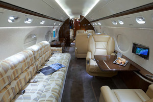 | Eighteen (18) passenger forward galley configuration featuring enhanced soundproofing. The forward cabin offers a four (4) place club arrangement followed by a two (2) place club opposite a four (4) place divan, the mid cabin features a four (4) place conference group opposite a credenza. The aft cabin consists of a single (1) forward facing VIP seat opposite a three (3) place berthable divan. Additional amenities include a certified Jump Seat; forward and aft lavatories. |