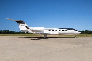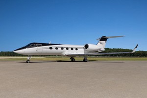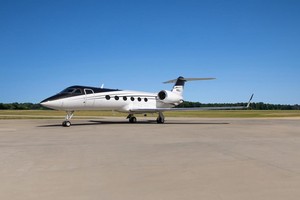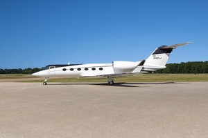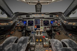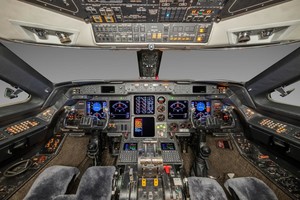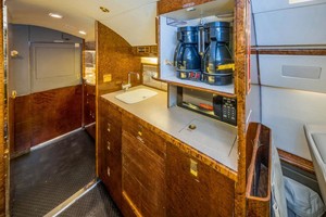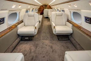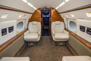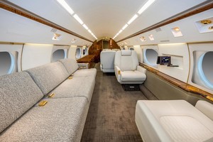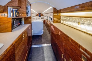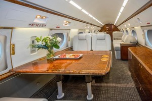 | Executive 13 Passenger, Forward 4-Place Club, Mid Cabin 2-Place Club Opposite 3-Place Divan, Aft 4-Place Conference Grouping, Crew Jumpseat, Forward galley, Medium Bird's-Eye Maple Woodwork, Forward & Mid-Cabin Foldout Tables, Aft Hi-Lo Table Opposite Credenza, Airshow 400, Dual DVD Players, 10-Disc CD Player w/Cassette & Tuner, Baker Sound System, Six Rosen 5.6-Inch Swing-Out Monitors, Large Wall-Mounted LCD Monitor Above Aft Credenza, Pop-Out Divan Armrest LCD Monitor, Accordion Window Shades, 115-Volt/60-Hz Outlets, Forward & Aft Lav w/Vanity w/Storage & Aft Baggage Access. |