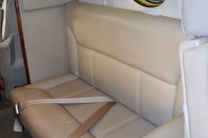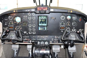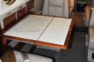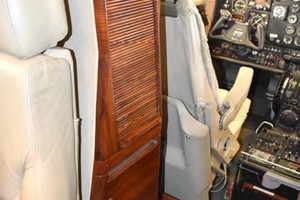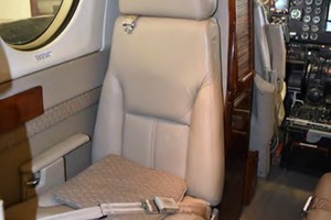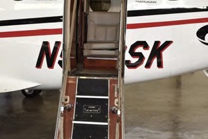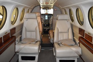 The executive interior features five seats in the main cabin with a two place divan in the forward right side, an aft belted lavatory seat adjacent the main entry door and two optional aft jump seats for a total of 10 passengers. The interior is finished in tan leather with accenting side panels and beige closed loop carpet.
