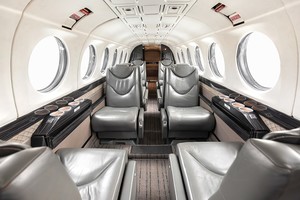 8 Passenger seating plus a belted lav, double club configuration with four executive storable tables.