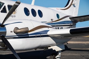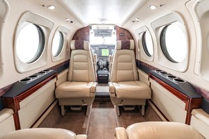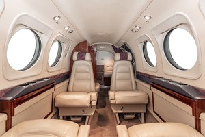 Four Lateral Tracking Cabin Chairs in Club Seating Arrangement. Aisle Facing Seat with Lap Belt. Private Lav Compartment with Electric Flushing Toilet. Chairs Covered in Beige Leather.