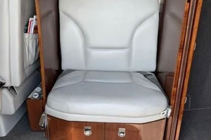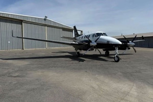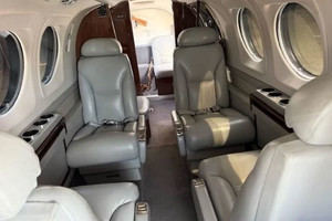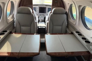 Interior Notes - The C90GTx cabin seats six passengers, with four executive leather swivel seats in a center club configuration with dual executive tables, a belted side facing seat, and an aft, fully enclosed flushing belted lavatory seat. In addition to the aft divider door, the cabin's privacy is further enhanced with a forward divider door that separates the cockpit from the rest of the cabin. A refreshment center is located in the forward cabin area.