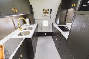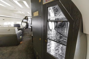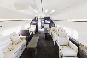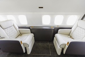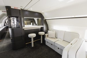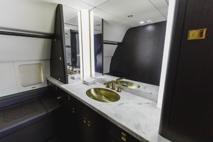 | 12 Passenger // Sleeps 8 Luxurious custom-designed seats throughout the cabin upholstered with contrasting premium Garrett leathers and intricate diamond pattern stitchwork. The forward cabinâs main lounge provides seating for nine passengers during taxi, takeoff, and landing, and there are four additional occasional seats. Main lounge divans upholstered in premium Garrett leathers. The aft lounge provides seating for three passengers during taxi, takeoff, and landing, and there are three additional occasional seats. This lounge converts into a bunkroom with four beds, or it can be set up as a conference/dining room with six seats. Mid-cabin divans upholstered in premium Loro Piana fabrics. The aft full-width master suite features an adjustable queen-size bed, a single occasional seat, and the master suite bath has a large vanity and shower. Full cabin re-veneered in open Grain White Oak Finish in Matte Dark Chocolate Color. New natural Arabescato stone countertops. Luxurious 100%-New Zealand-wool carpeting by RedRock throughout the cabin. |