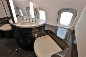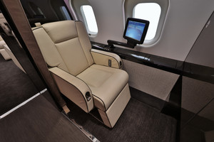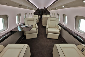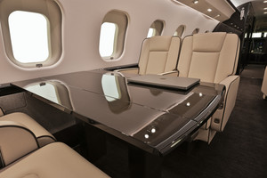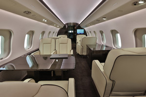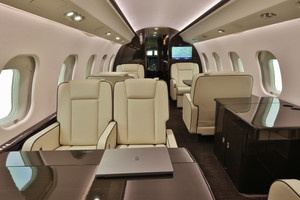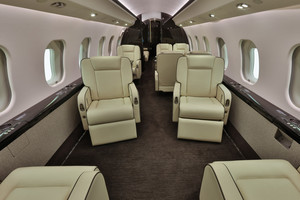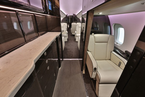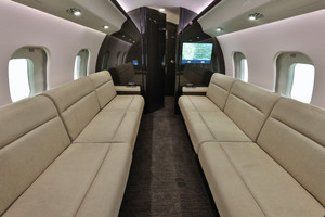| The cabin is configured for 14 passengers. Immediately aft of the cockpit features a right-hand forward lavatory, followed by the forward right-hand galley, which is equipped with a TIA Wavejet Microwave, TIA Hi-Temp Oven, Espresso and TIA Coffee Maker and an Air Chiller. Opposing the galley is left-hand crew rest area just aft of the main entrance door. Continuing aft through a pocket door and entering the main cabin area is a four (4) place club followed by a left-hand four (4) place conference group that opposes a single seat and workstation. A cabin bulkhead with a pocket door separates this area from the aft cabin seating. Moving aft through the pocket door is a left-hand two (2) place berthable 16G divan that opposes a right-hand three (3) place berthable 16G divan, which is certified for only two (2) TT&L passengers when the removable bulkhead is installed on the right-hand side. Further aft is the lavatory followed by the baggage compartment. |