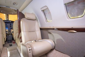 | A Classic CJ1 seating configuration featuring a side-facing seat across the main entrance door, followed by a four-place club, and an aft belted lavatory. |