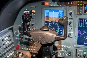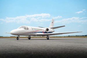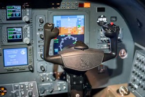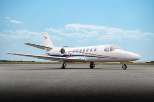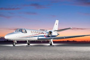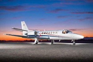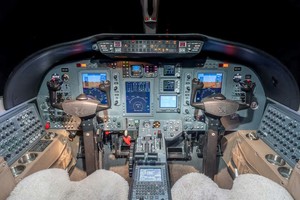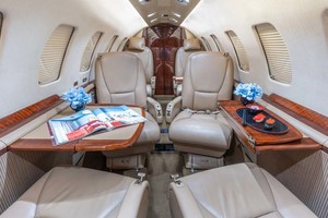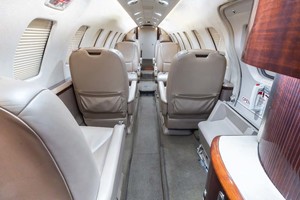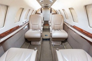 | Seven (7) passenger executive beige interior in a center club arrangement with two (2) Executive writing tables and three (3) under seat storage drawers. Forward deluxe slimline galley, aft enclosed lavatory with belted flushing toilet. Cypress Townsend leather Seats, High Gloss Wood Veneer & Satin Champagne Gold Hardware. |