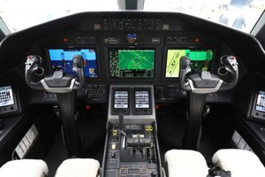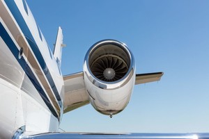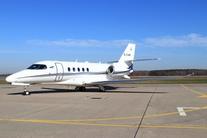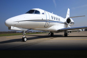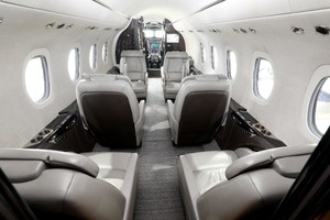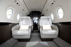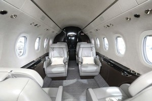 | This eight passenger executive configuration features six leather passenger seats in the main cabin, a two place side-facing divan in the entryway, and an aft lav. The forward refreshment center includes a microwave and provides storage for an assortment of beverages and light snacks. |