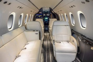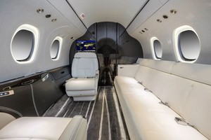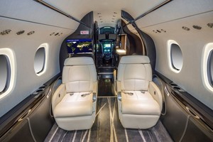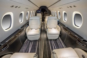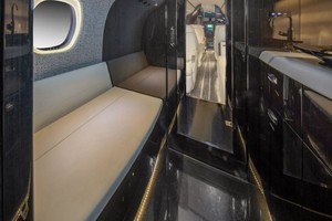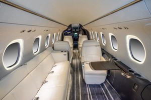 | (Original) This elegantly appointed 10-passenger interior features a two-zone cabin with a forward galley and aft lavatory. The configuration includes a certified crew jump seat, a side-facing seat adjacent to the galley, a forward double club seating arrangement, and an aft club opposite a three-place divan. |