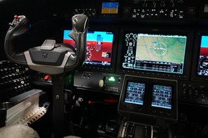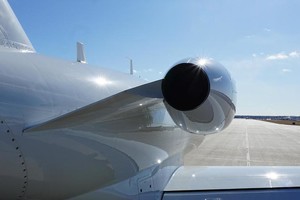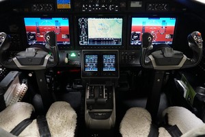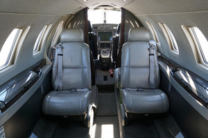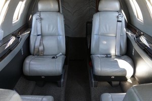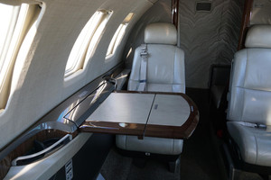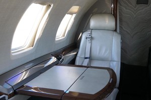 | Passengers: 6. Executive Cabin Seating with Dual Writing Tables. Forward Side Facing Seat, Aft Side Facing, Belted Flushing Lav. High Gloss Wood Veneer Cabinetry and Table Tops. Satin Chrome Plating with High Gloss Satin Platinum Side Ledges. Classic Tanis Grey Leather Seating with Matching Accents and Seat Belts. |