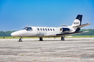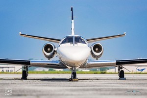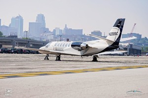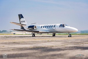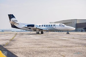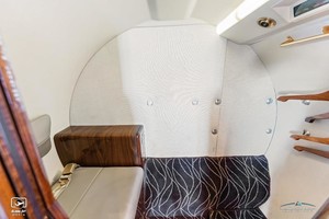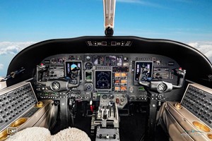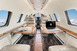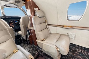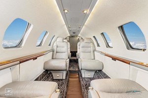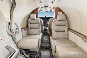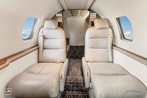 | (2008) Tan leather eight/nine-passenger interior with belted aft lav. Features double club seating, slimline galley, and carpet and leather re-dye. |