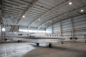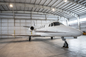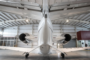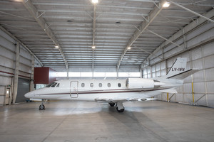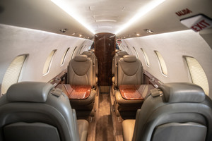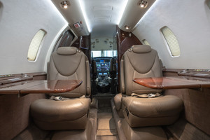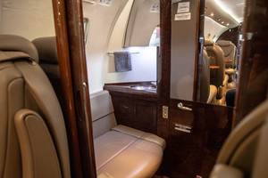 | The Cabin is configured with standard center club seating, with RH forward closet and RH forward side-facing seat, standard floor tracking on seats 5 & 6, standard 180 degree swivel and full recline on all seats. LH forward Refreshment Center with general storage, 2 hot liquid dispensers, cup dispensers, ice drawer, food tray storage, pop storage and trash drawer, 110 volt Universal outlets are located in RH forward closet and lower sidewalls at seats 6 & 7, AxessIl handsets are located in lower sidewall at seats 6 & 7 and the flight deck overhead. Interior has executive tables and slim line tables in wood Veneer, a magazine rack, standard aft dividers with sliding doors. RH externally serviceable toilet and LH jumpseat with fold down backrest. The cabin is equipped with dual disc DVD player, Airshow 410 system with four plug-in Rosen Screens with Receptacles |