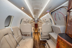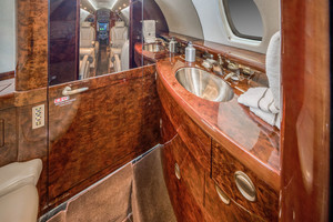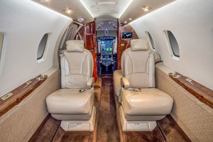 | 8 passengers. Forward right-side closet, aft centerline closet. Beige interior with mid-cabin club & forward 2 place side-facing seat. Beige lower sidewalls. Forward LS refreshment center. Highgloss wood veneer, executive & slim line tables. Airshow 500 Plus moving map display.110VAC universal outlets. Beige window reveals, antique bronze plating. Aft full lav with sink, cabinetry, storage closet and externally serviceable flushing toilet. New seat leather and wood refinished November 2014. |