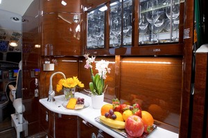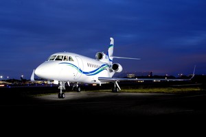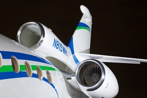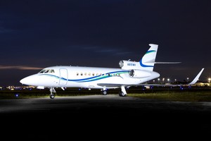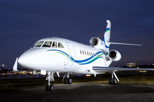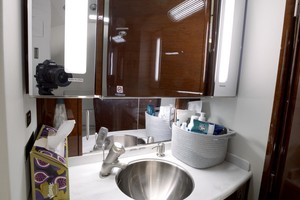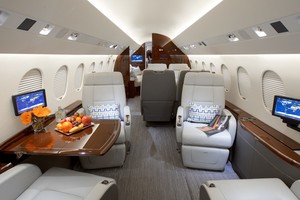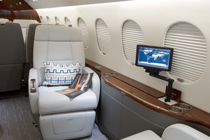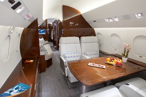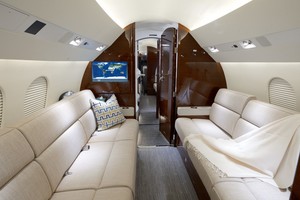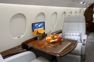 | The fourteen (14) passenger interior configuration consists of a forward 4-place club with two writing tables and mid-cabin 4-place club with a table in between and two aft 3-place berthable divans. The seats are finished in Light Cream leather and complemented by Light Grey inlayed carpet, Cream Ultra Leather headliner, dark sandstone lower side panels, Nickel hardware and Medium Brown high gloss woodwork. The forward galley/bar contains Corian work surface, sink, lighted crystal display, clean ice drawer, cold storage chest with bottle sleeves, flatware drawer, china storage, high temp oven, microwave oven, thermos carafe and espresso machine. Other cabin features include galley sliding pocket door, forward closet/entertainment cabinet and Aircell Cordless handsets. Inflight entertainment includes a Collins Falcon Cabin Management System with a LED backlit touch screen master control located in the galley, moving map inflight display, forward and aft LED monitors, two individual 10.6â LED plug in monitors. |