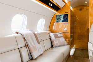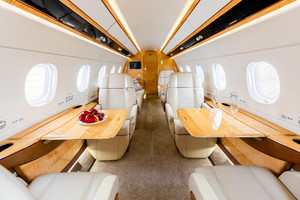 Ссылка на объявление| This interior seat 10 passengers, which includes a belted aft lavatory. It features a forward 4-place club seating with foldout tables and an aft section with a 3-person berthable divan (certified for two during takeoff and landing) opposite two club seats. Additional amenities include a fully equipped forward galley, an aft storage closet, and elegant stone flooring in the galley and lavatory. |