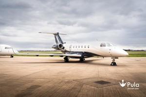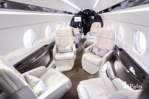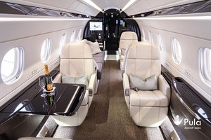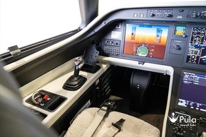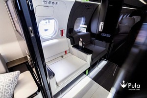 | (Original Interior by Embraer) Luxurious 10 (9 1 belted lav) 6 seats featuring a 4-place club seat configuration with two foldout side ledge tables in the forward cabin, followed by a right mounted, 3-person berthable divan opposite two club seats in the aft cabin. A well-equipped forward galley, aft lavatory with belted toilet and aft storage closet, as well as stone flooring in galley and lavatory, complete this well-equipped interior. |