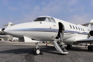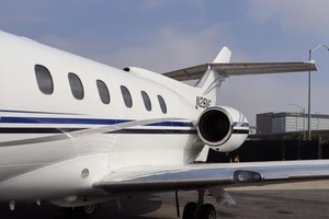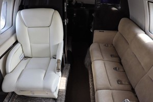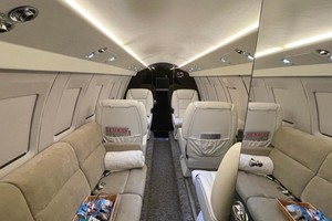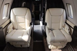 | Eight passenger interior. Forward club with aft three place divan opposite a single executive seat. Forward refreshment center opposite internal baggage storage. Executive seats covered in White leather. Divan covered in Suede-like fabric. Dark wood cabinetry. Cabin privacy door. |