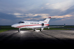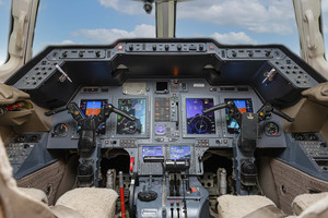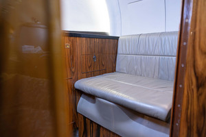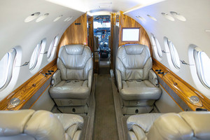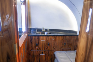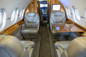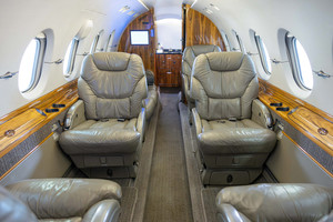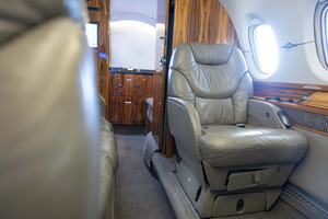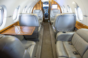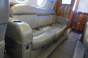| The executive seating configuration accommodates nine (9) passengers and includes a forward refreshment center, executive writing tables, and 110v outlets for convenience. The cabin layout features four (4) seats in a club arrangement, one (1) forward-facing aft seat, a three (3)-place divan, and a belted lavatory seat certified for takeoff and landing. Airshow 400 displays are located on the forward and aft bulkheads. |